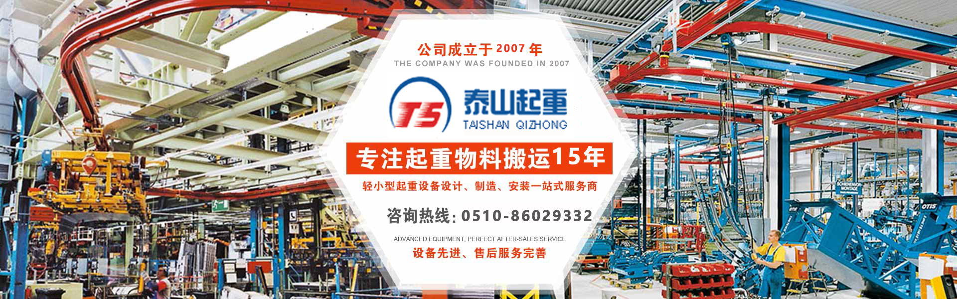 江陰市泰山起重設(shè)備有限公司座落在富庶的現(xiàn)代化港口城市——江陰市南閘鎮(zhèn)工業(yè)園區(qū),緊靠錫澄高速,錫澄路,北依江陰港區(qū),貫通滬寧高速的世界第四、中國(guó)第一的江陰長(zhǎng)江大橋,穿越而過(guò),飛架南北,高速至上海虹橋機(jī)場(chǎng)僅2小時(shí),南又緊靠正在建設(shè)中的無(wú)錫國(guó)際機(jī)場(chǎng),交通便捷,環(huán)境優(yōu)美。  本公司專(zhuān)業(yè)為壁行式懸臂起重機(jī)、KBK軌道,鋼絲繩電動(dòng)葫蘆、環(huán)鏈葫蘆、KBK組件,梁式起重機(jī)、電動(dòng)旋臂起重機(jī)等配套起重機(jī)械配件,主要產(chǎn)品有:KBK軌道,梁吊掛裝置、環(huán)鏈葫蘆,KBK組件,手動(dòng)式小車(chē)、行車(chē)走輪、電纜滑車(chē)等起重機(jī)配件,同時(shí)可提供起重設(shè)備的安裝、維修、為客戶(hù)提供全方位的技術(shù)咨詢(xún)等各項(xiàng)服務(wù)。  公司的管理將“以人為本”作為宗···...